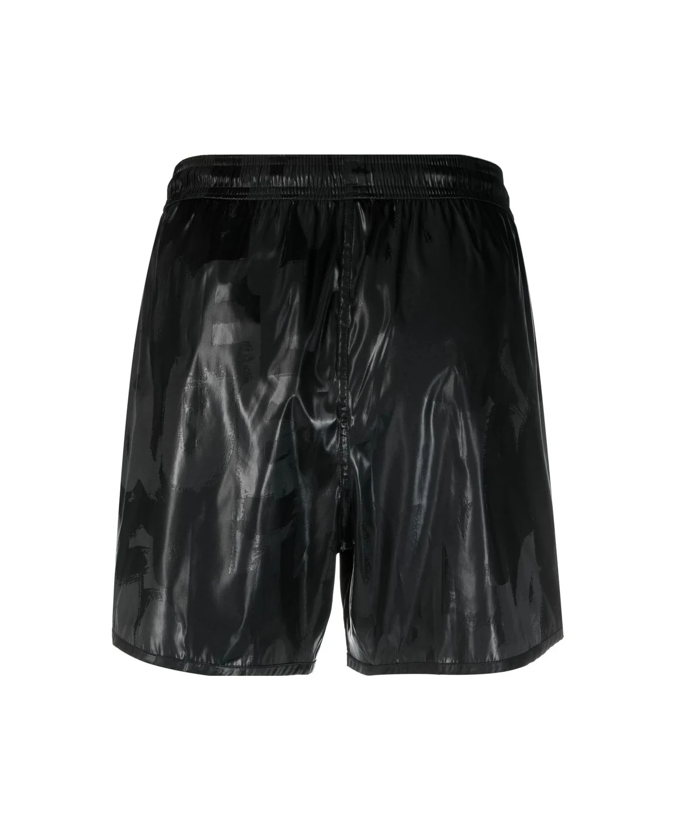 Alexander McQueen swim shorts made of black technical fabric with a shiny wet effect finish and an all-over tone-on-tone McQueen Graffiti jacquard pattern. The garment has an elasticated waist, two pockets at the sides and a small contrasting McQueen Graffiti print on the front bottom.