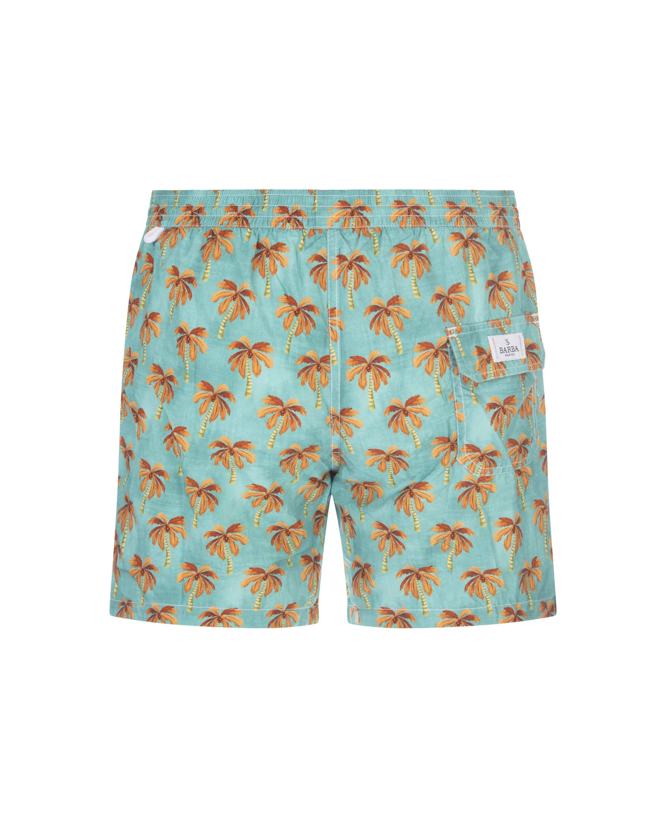 Barba swim shorts made of aquamarine nylon with an all-over contrasting palm pattern. The garment features an elasticated waistband with white drawstring and logo patch stitched on the flap of the back pocket.