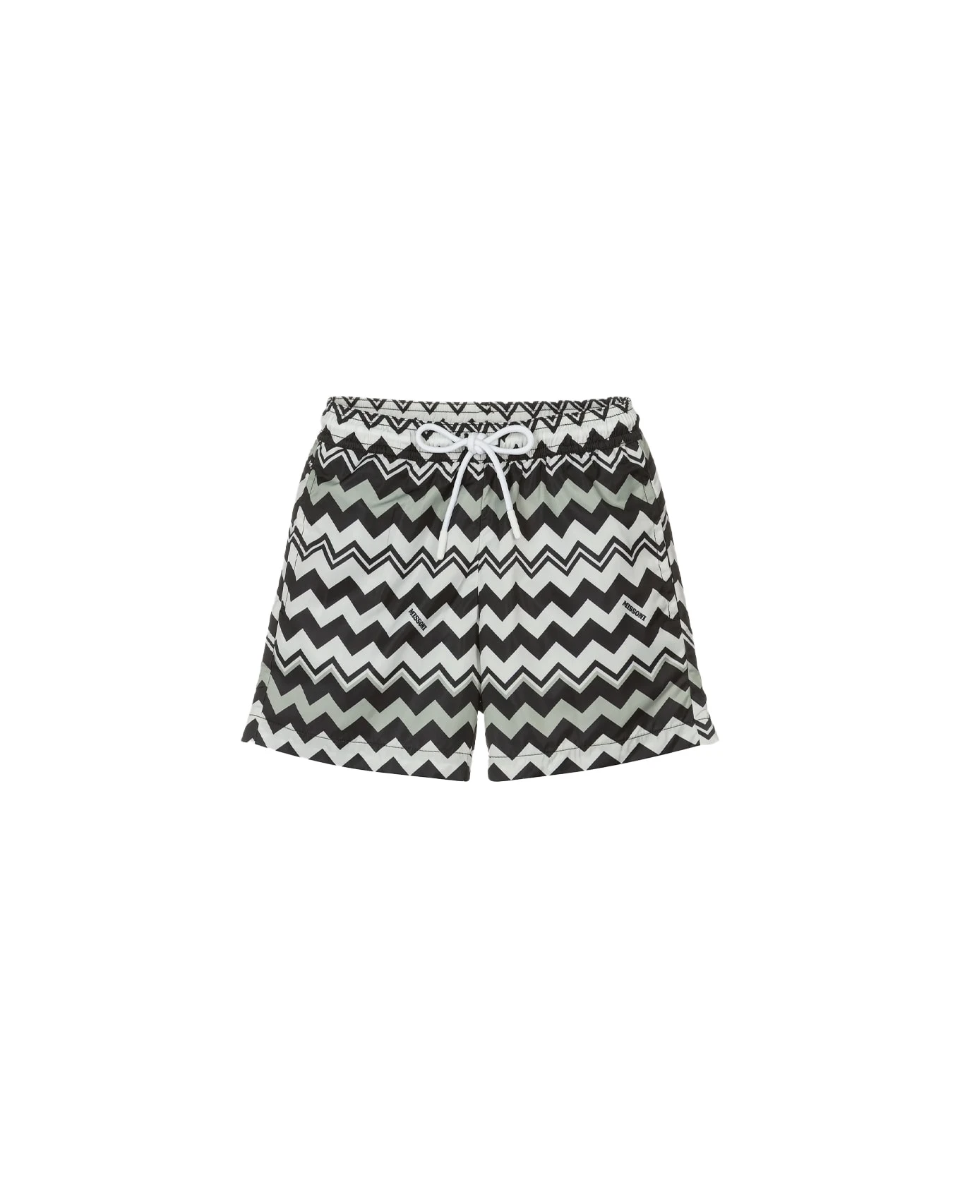 Missoni Kids swim shorts made of technical fabric with a black, grey and white chevron pattern. Model with side pockets and elasticated waist with drawstring.