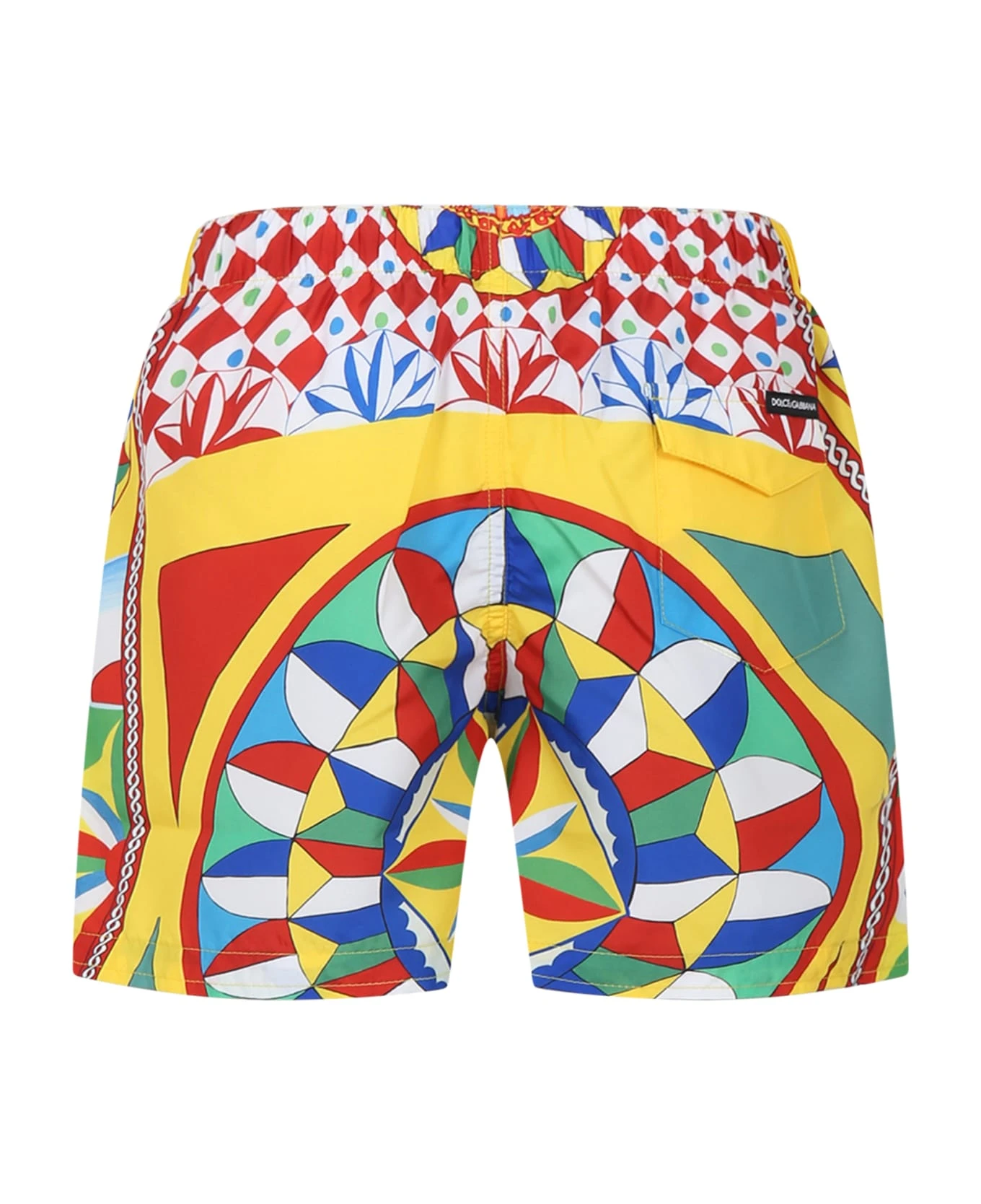 Yellow swim boxer, with elastic and drawstring waist, back pocket. It is embellished with red logo on the front and all-over iconic cart print.