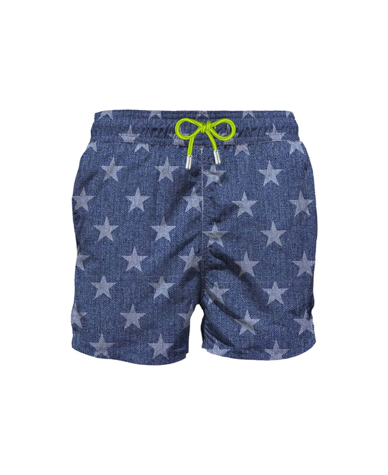Blue Star all over print, Swim Short mid-lenght, regular fit, blue microfiber, comfortable drawstring waist, inside ergonomic brief, fluo yellow drawcord closure, pockets on both sides, backside classic pocket with velcro closure. CARE INSTRUCTIONS