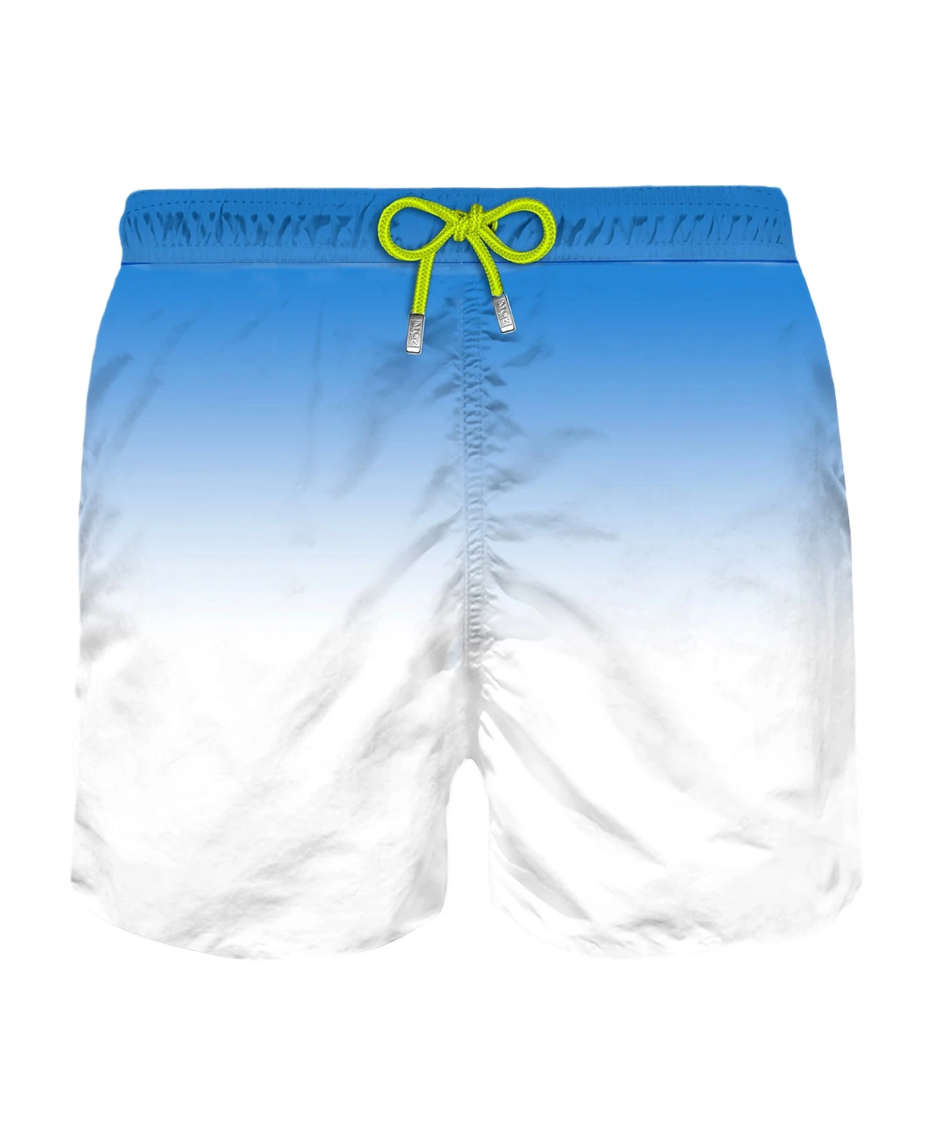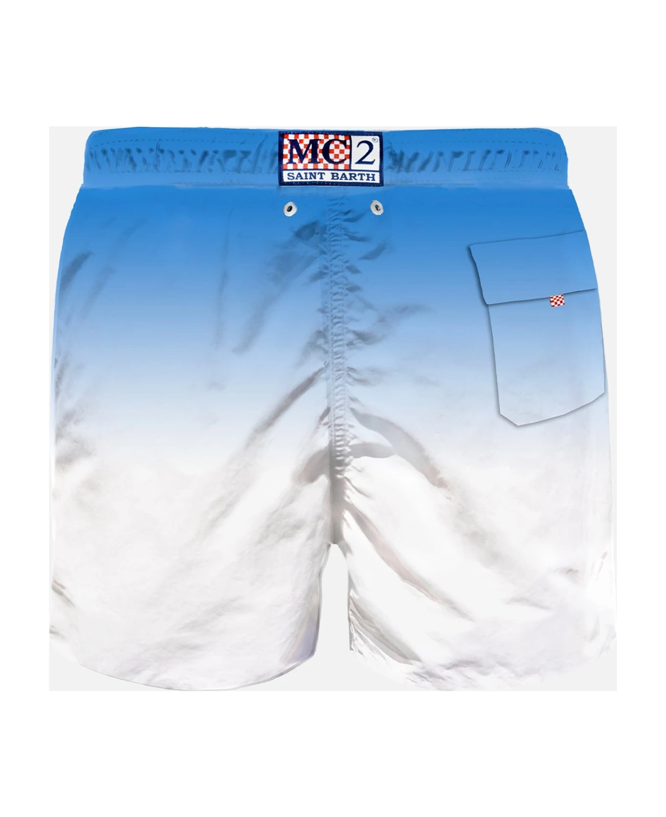 Mens Swim Shorts mid-lenght, bluette and white gradient print;regular fit, microfiber, inside ergonomic brief, pockets on both sides, drawcord closure, backside classic pocket with velcro closure.