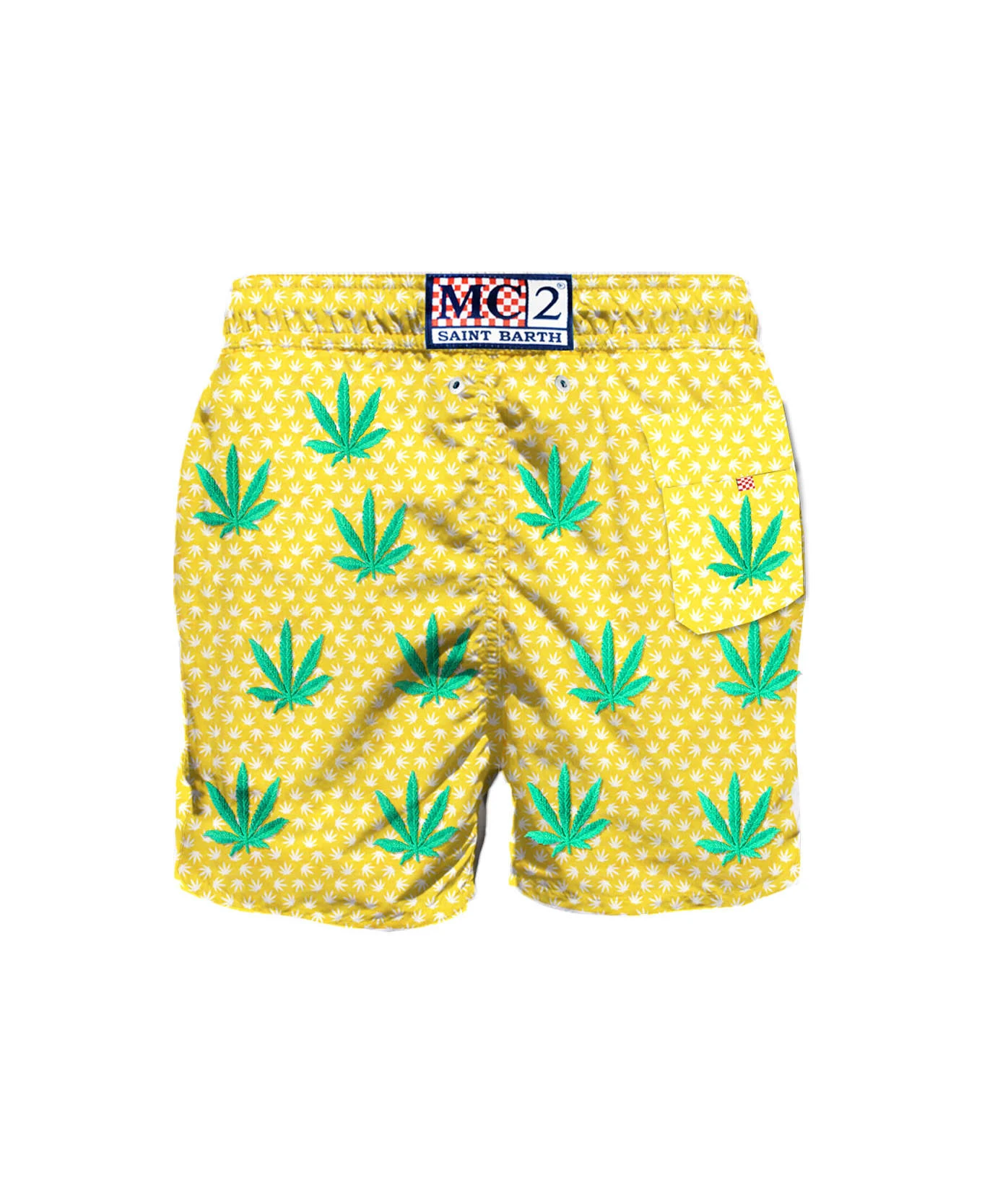 Discover the MC2 Saint Barth spring summer men’s collection! A lot of funny and colored print are waiting for you, for your amazing holidays! Green leaves declined in the embroidered version, on yellow backcloth. Mid-lenght swim short, regular fit, microfiber fabric, drawcord closure, inside ergonomic brief, pockets on both sides, backside classic pocket with velcro closure. CARE INSTRUCTIONS