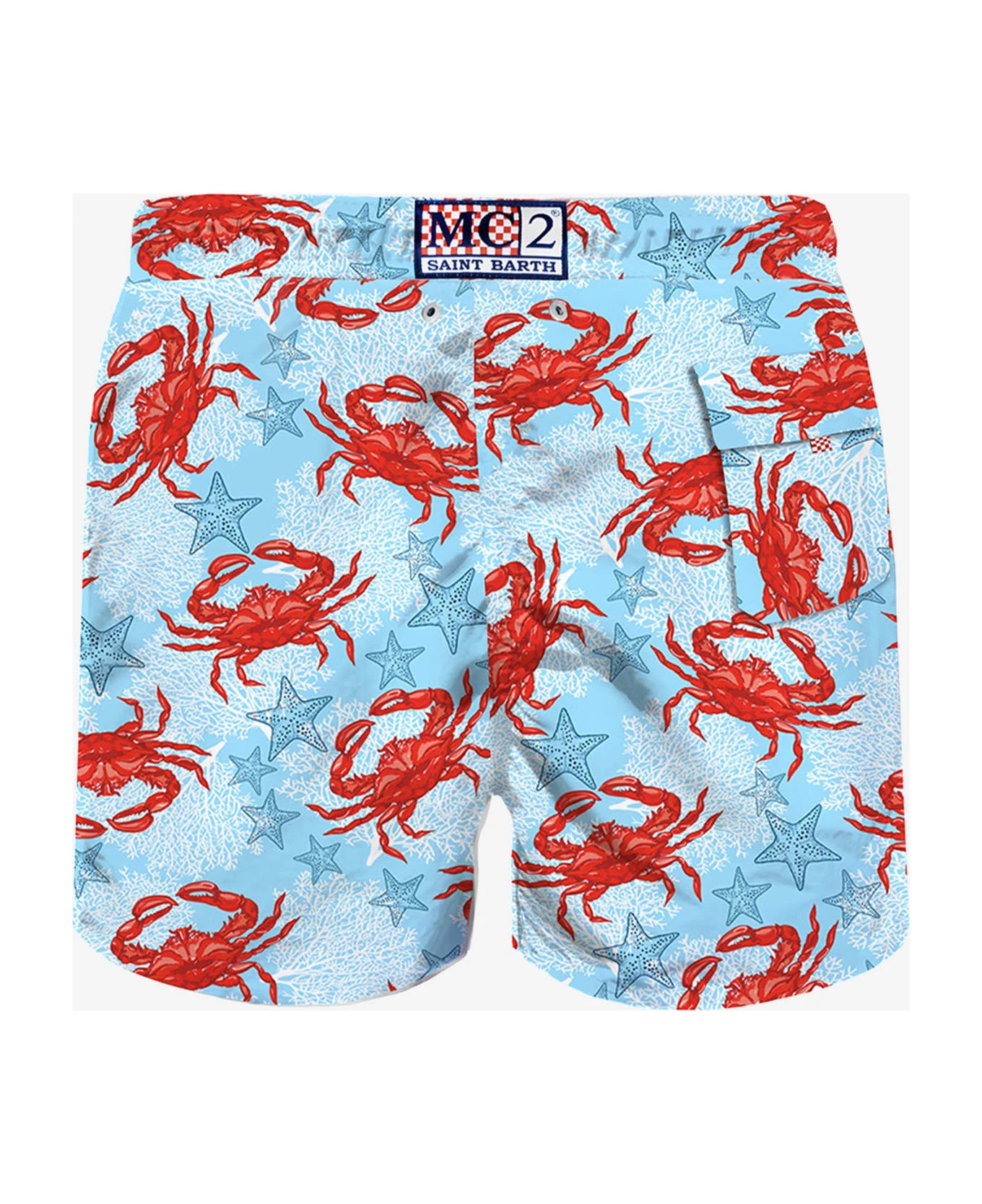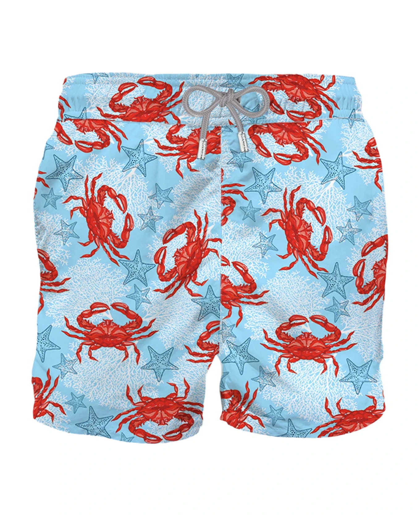Mens Swim Shorts mid-lenght, light blue with crab print; regular fit, microfiber, inside ergonomic brief, pockets on both sides, drawcord closure, backside classic pocket with velcro closure.