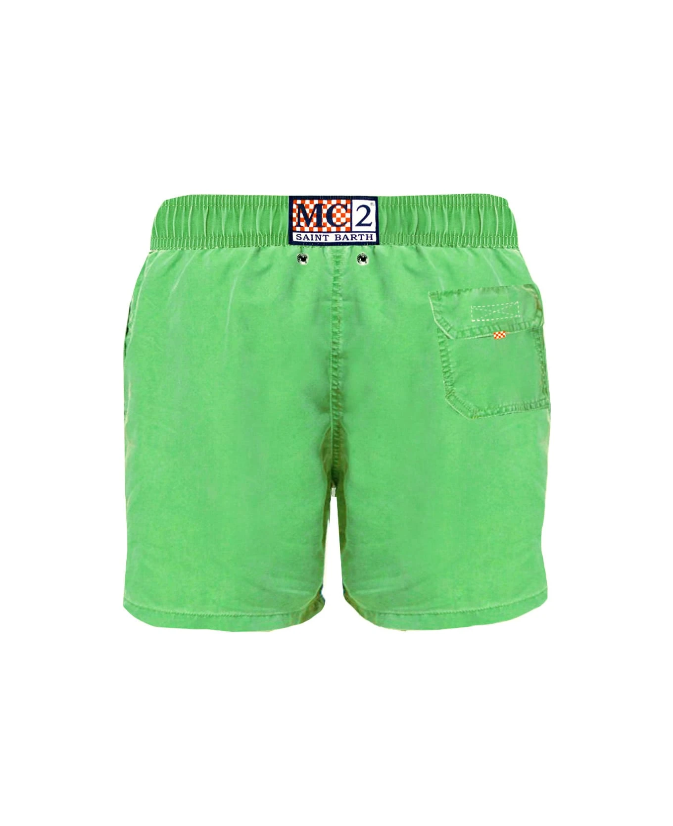 Men’s Swim Shorts mid-lenght, solid green microfibre regular fit, velvety hand feel fabric, comfortable drawstring waist, inside ergonomic brief, backside classic pocket with velcro closure. CARE INSTRUCTIONS