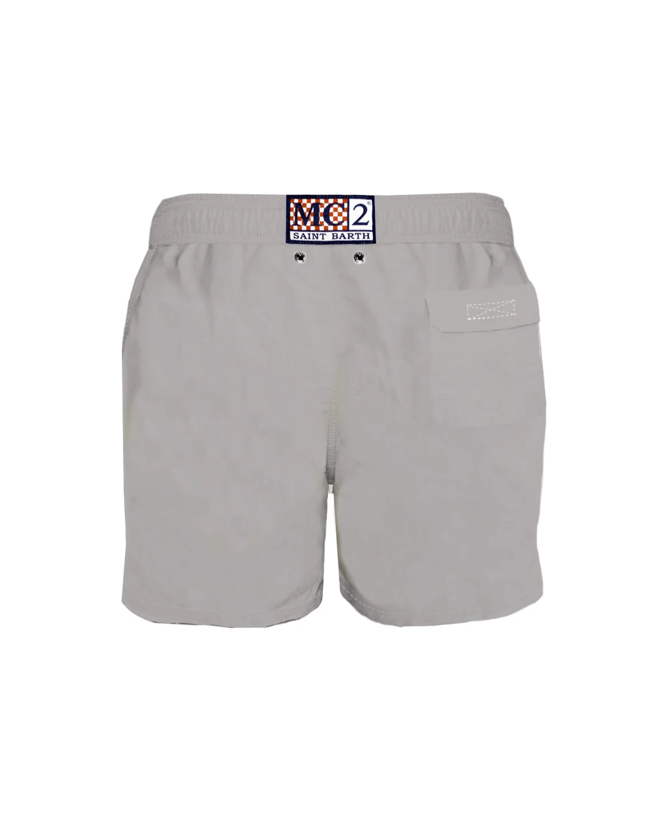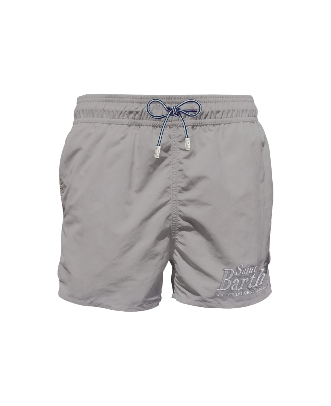 Men’s Swim Shorts mid-lenght, silver microfibre, St. Barth front embroidered, regular fit, velvety hand feel fabric, comfortable drawstring waist, inside ergonomic brief, backside classic pocket with velcro closure. CARE INSTRUCTIONS