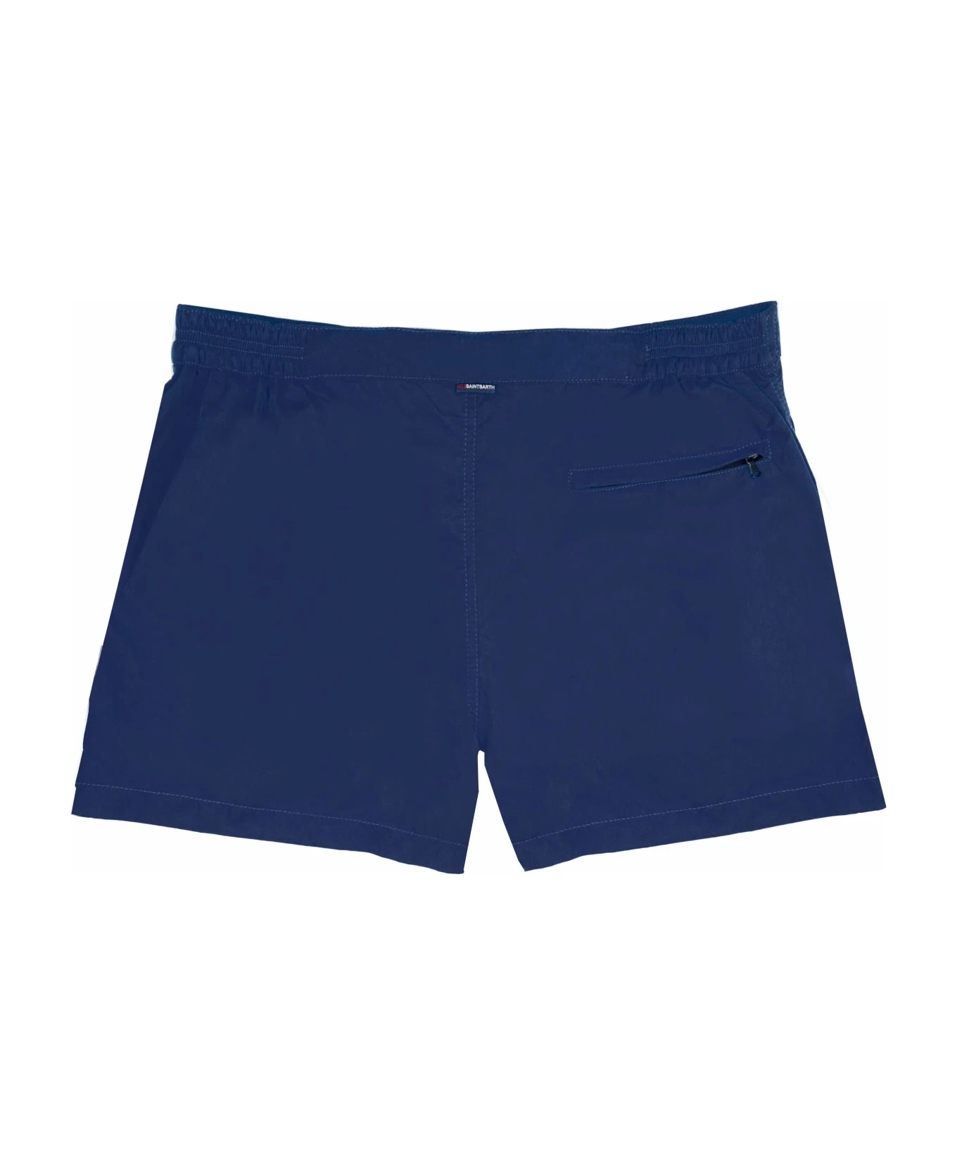 Shorter-Lenght Swim Trunks, vintage style, slim fit, blue navy solid microfibre, invisible front magnetic botton and zip closures, sides elasticated waistband for comfort, inside elasticated with buttons, light net lining, front pocket with embroidery, pockets on both sides, back pocket with zip. CARE INSTRUCTIONS