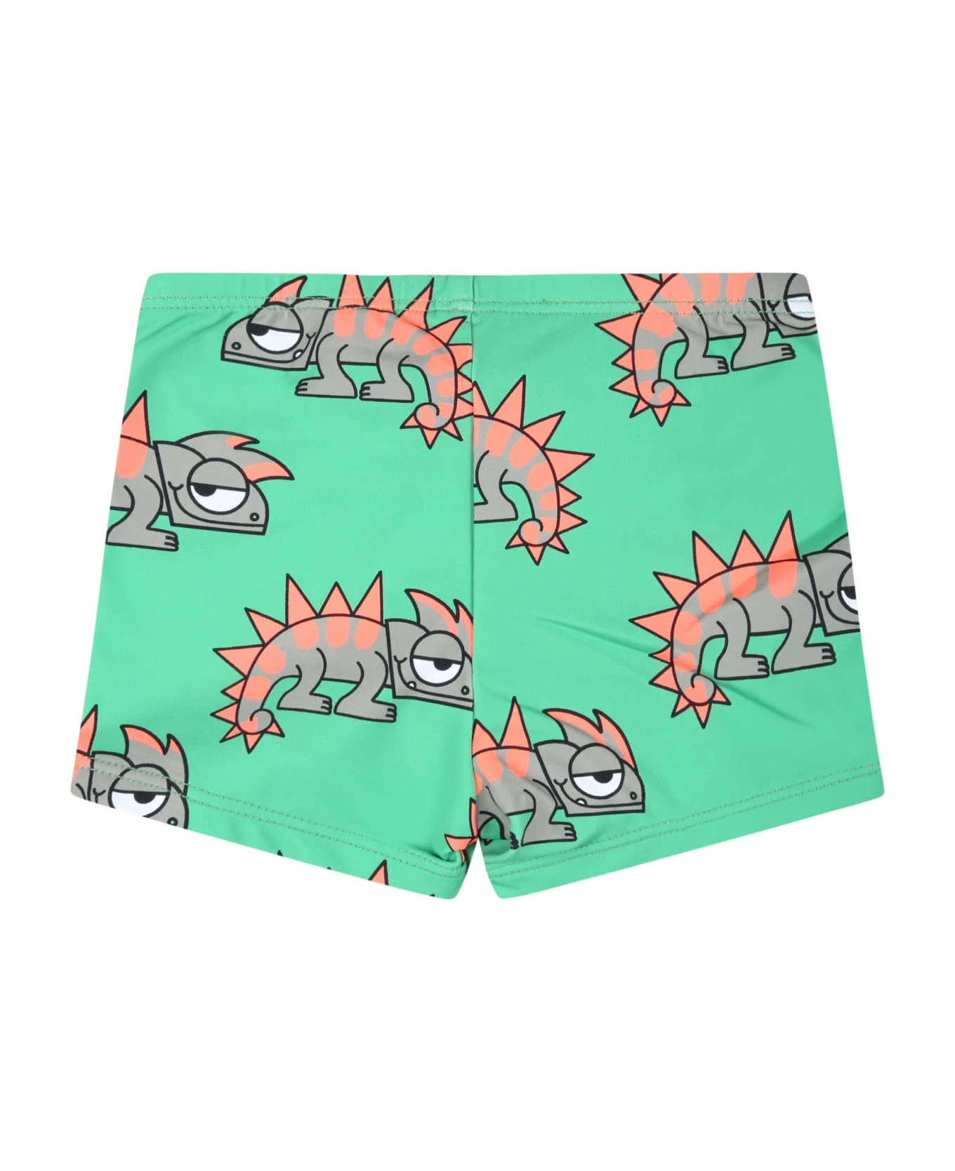 Green swim trunks with elasticated drawstring waist, embellished with all-over chameleons.