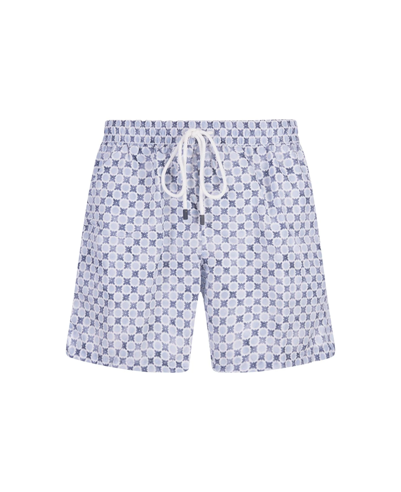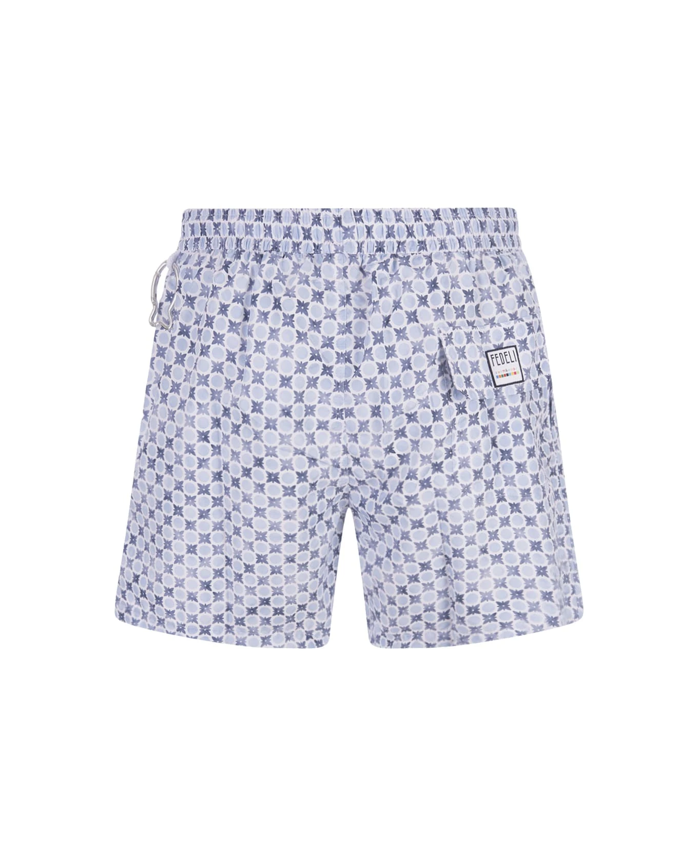Fedeli swim shorts made of white technical fabric with blue all-over pattern of flowers and polka dots. The garment features an elasticated waistband with drawstring, side slash pockets, metal snap hook and a back pocket with flap and logo patch.